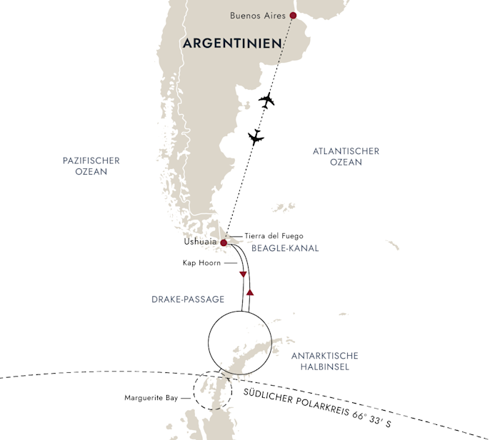 Während des antarktischen Sommers eröffnen sich neue Routen, die durch das Meereis unterhalb des Polarkreises führen.An Bord unseres hybridbetriebenen eisklassifizierten Expeditionsschiffs nehmen wir Kurs auf die Marguerite Bay und die Inseln entlang des Weges, halten Ausschau nach Adeliepinguinen und besuchen auch abgelegene historische Stationen.