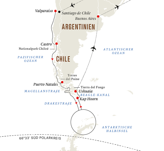 Von Valparaíso aus erkunden Sie zunächst die chilenischen Fjorde und Wasserstraßen Patagoniens mit Zwischenstopps im ländlichen Castro und in Puerto Natales, wo Sie die Möglichkeit haben, im Nationalpark Torres del Paine zu wandern. Wenn das Wetter es zulässt, werden wir versuchen, am legendären Kap Hoorn anzulanden, bevor wir auf dem Rückweg vom Weißen Kontinent die Drake-Passage durchqueren.
