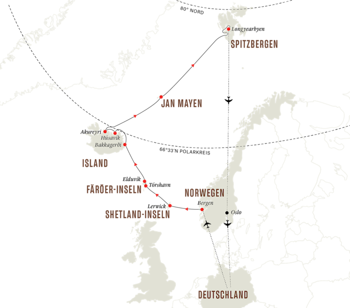 Wir starten im norwegischen Bergen und besuchen die Shetland-Inseln, die Färöer-Inseln, erkunden an drei Tagen die Nordküste Islands und reisen über die Vulkaninsel Jan Mayen auf das malerische Spitzbergen, welches wir drei Tage erkunden