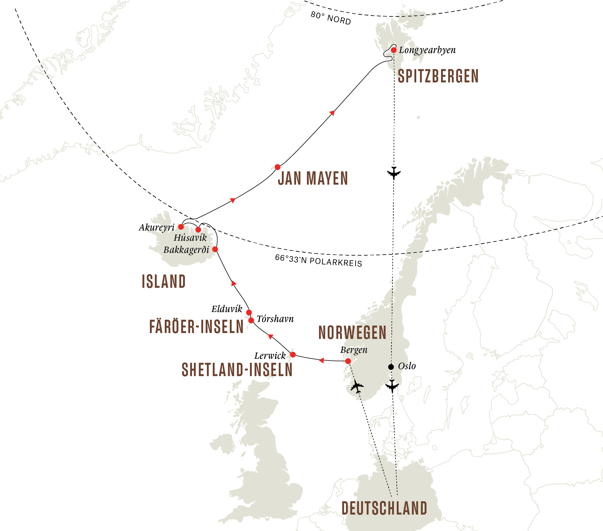 Wir starten im norwegischen Bergen und besuchen die Shetland-Inseln, die Färöer-Inseln, erkunden an drei Tagen die Nordküste Islands und reisen über die Vulkaninsel Jan Mayen auf das malerische Spitzbergen, welches wir drei Tage erkunden