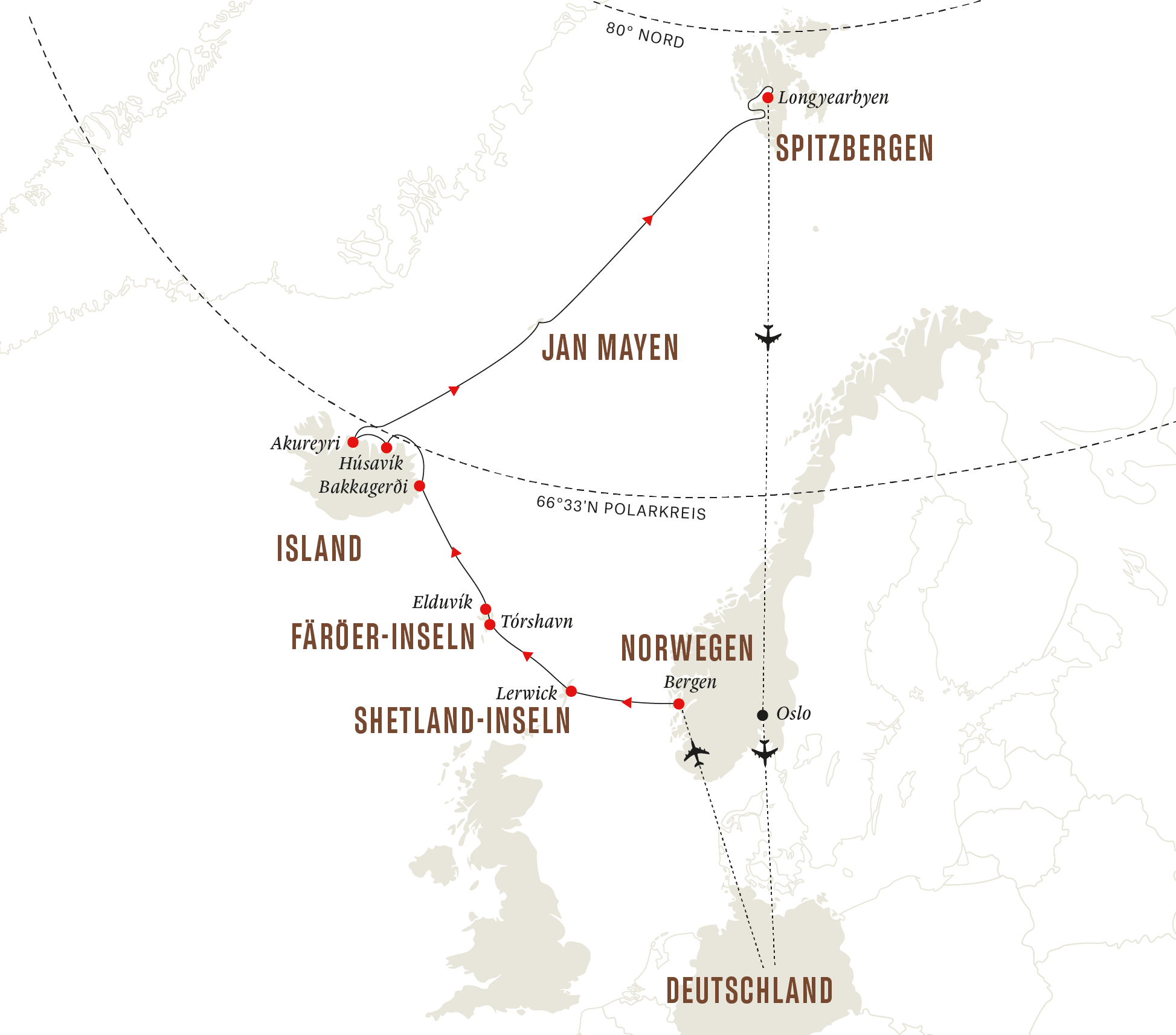 Unser Frühlingsabenteuer beginnt im norwegischen Bergen und führt uns zunächst nach Lerwick auf den schottischen Shetland-Inseln. Von dort aus fahren wir zu den grünen Färöer-Inseln und überqueren dann die Nordküste Islands. Unsere Expeditions-Seereise endet in Longyearbyen, nachdem wir zuvor in der Arktis das malerische Spitzbergen mit all seiner Unberührtheit erkundet haben.