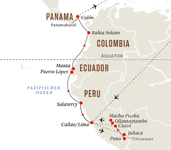 In Lima gehen Sie an Bord Ihres Schiffes und fahren die Pazifikküste hinauf. Unterwegs entdecken Sie die antiken Königreiche von Trujillo, das farbenfrohe Puerto Bolívar und die Surferstrände von Manta. Sie erleben in Bahía Solano die lebhafte afrikanisch-kolumbianische Kultur und durchfahren schließlich den legendären Panamakanal.