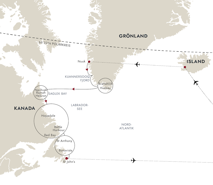 Begleiten Sie uns von Nuuk aus auf einer Seereise entlang der Westküste Grönlands und durch die Labradorsee, um Neufundland und das subarktische Kanada zu erkunden.