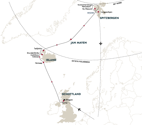 Gehen Sie in Glasgow (Fairlie) an Bord und nehmen Sie an einer aufregenden Reise in die Arktis teil, bei der wir Island, Jan Mayen und Spitzbergen erkunden.
