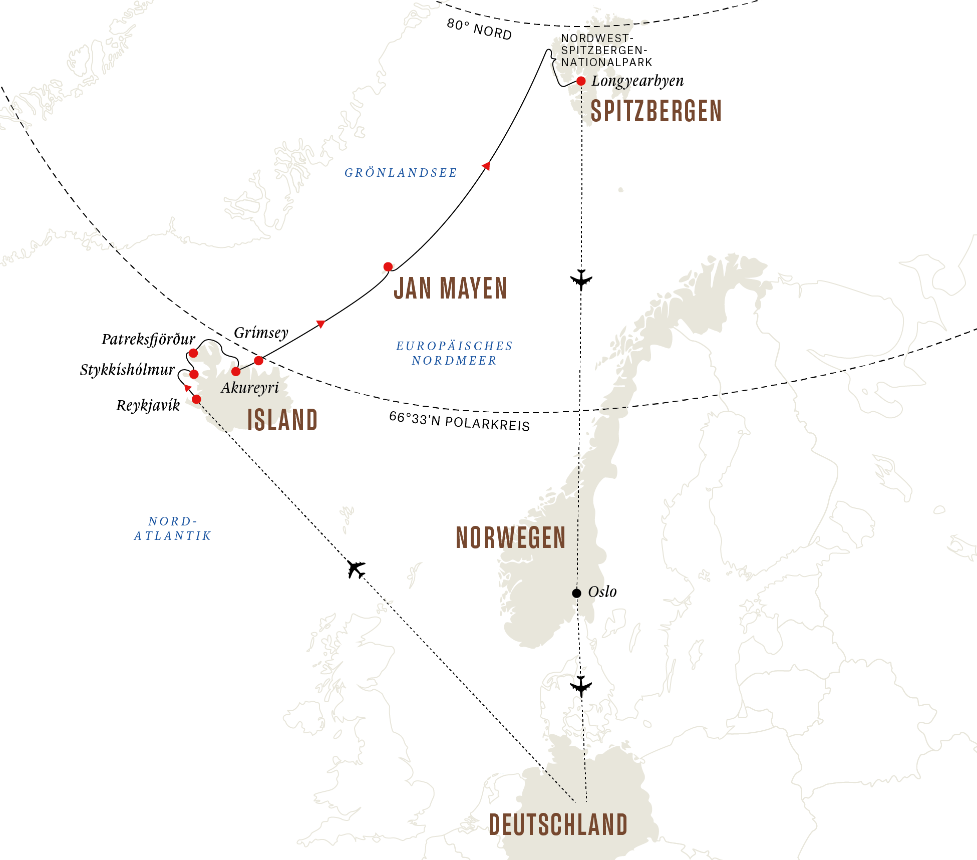 - Flüge in der Economy Class von Deutschland nach Reykjavík und von Longyearbyen (über Oslo) zurück nach Deutschland inklusive aller Steuern (es kann ein Flughafenzuschlag anfallen), Rail&Fly-Ticket hin und zurück