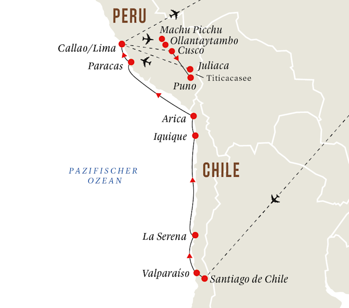 Erkunden Sie die herrliche Küste von Chile und Peru, bevor Sie auf dieser Seereise und bei Ihren Abenteuern an Land das sagenumwobene Machu Picchu erleben, den Altiplano überqueren und den Titicacasee besuchen.