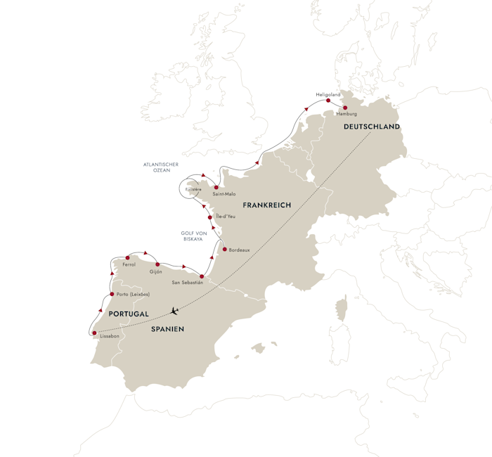In Frankreich erwarten Sie fantastische Eindrücke in Bordeaux, auf der Île-d’Yeu und in der Bretagne. Freuen Sie sich auf bemerkenswerte Küstenlandschaften, malerische Fischerdörfer und mittelalterliche Städte mit einer reichen Seefahrtgeschichte. Erkunden Sie Harlingen in der Provinz Friesland, bevor Sie Ihre Reise in der weltoffenen Metropole Hamburg beenden.