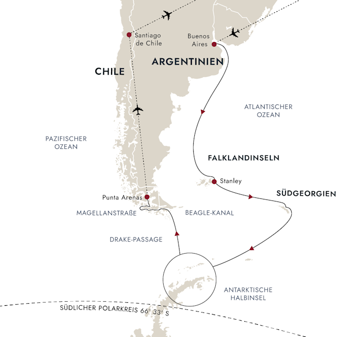 Ihre Reise beginnt mit einem Flug von Deutschland nach Buenos Aires.