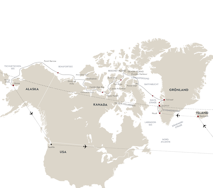 Folgen Sie nach dem Auftakt im beeindruckenden Grönland den Spuren legendärer Entdecker und unternehmen Sie mit uns den Versuch, durch die legendenumwobene Nordwest-Passage nach Alaska zu gelangen.