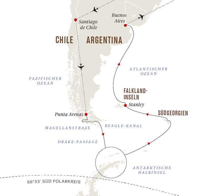 26-tägige Expedition in die Antarktis, nach Südgeorgien, zu den Falkland-Inseln und nach Buenos Aires, beginnend in Punta Arenas in Patagonien