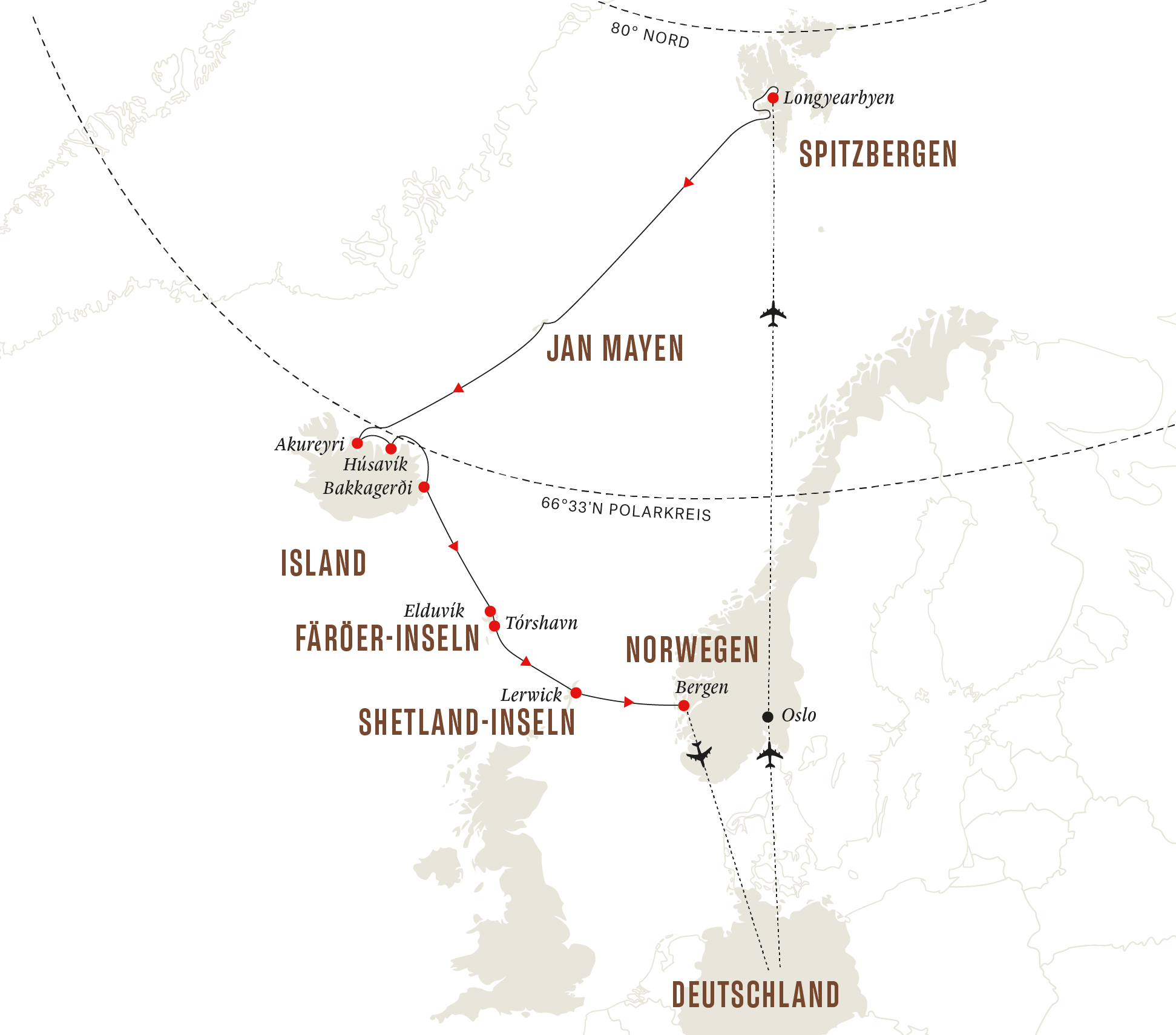 Fliegen Sie von Deutschland nach Oslo und weiter in die nördlichste Stadt der Welt, Longyearbyen, und nehmen Sie an einer Expeditions-Seereise teil, um die faszinierenden Landschaften Spitzbergens zu entdecken. Erleben Sie die Vulkanlandschaften Islands und halten Sie Ausschau nach Weißschnauzendelfinen und Schweinswalen sowie nach Buckel-, Zwerg- und den selten zu sehenden Blauwalen.