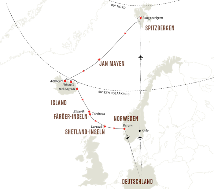 Ihre Reise beginnt mit einem Flug von Deutschland nach Oslo, gefolgt von einem Anschlussflug nach Longyearbyen.