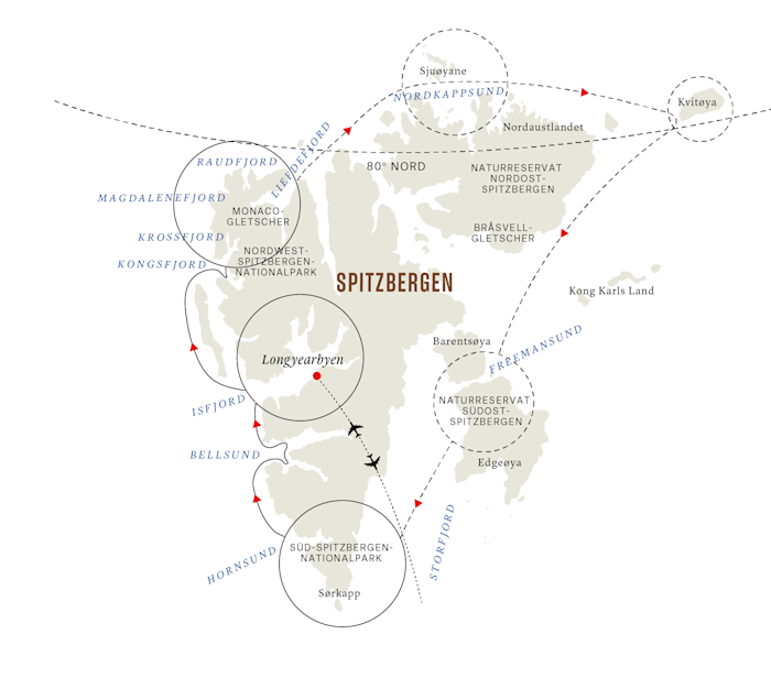 12-tägige Expeditions-Seereise, die in Longyearbyen beginnt und den Versuch einer vollständigen Umrundung der Inselgruppe Spitzbergen umfasst.