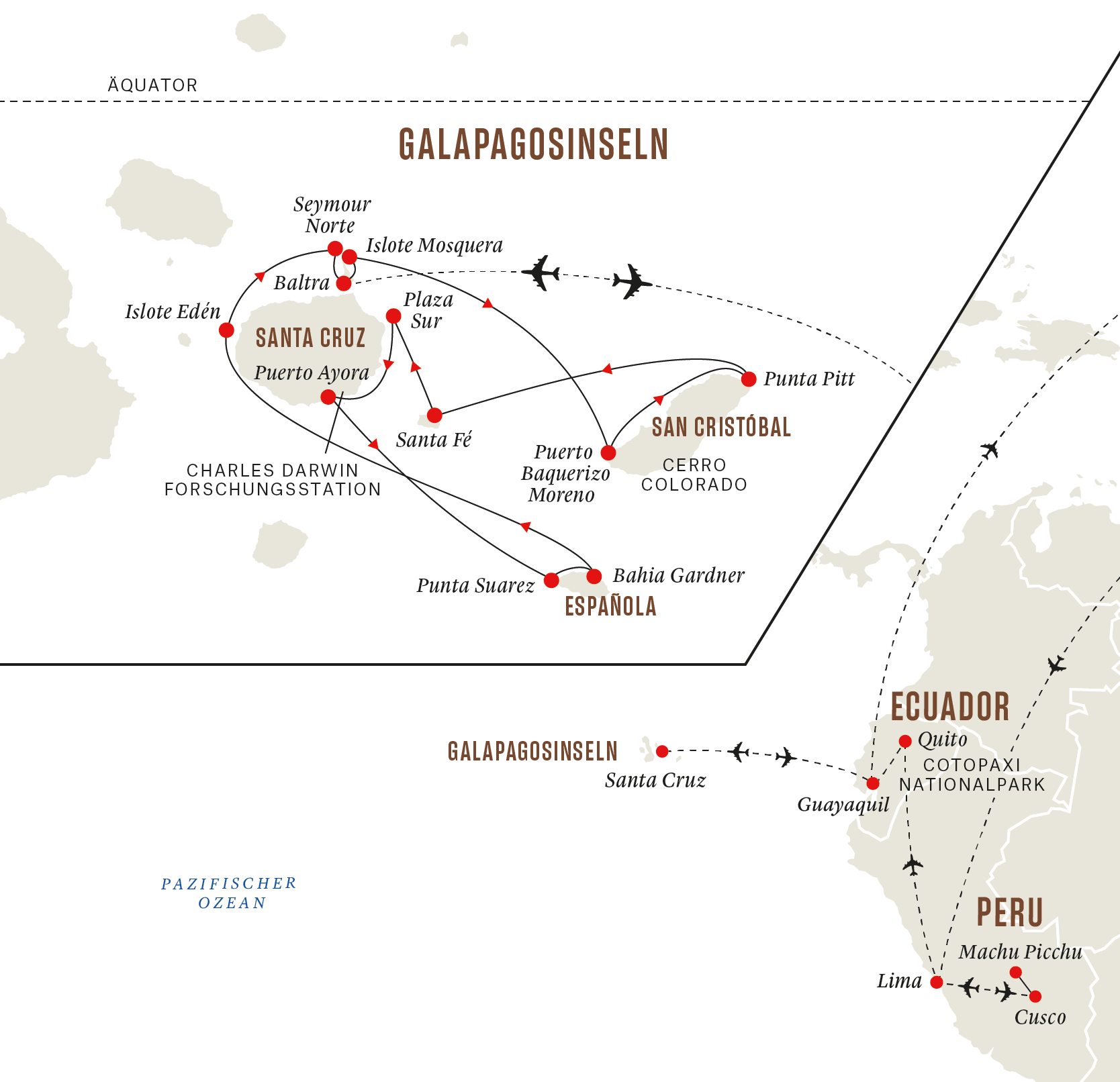 Begleiten Sie uns auf eine historische und ökologische Entdeckungsreise, auf der wir die verlorene Hochkultur der Inkas in Peru besser kennenlernen, Zeit mit der Erkundung von Quito verbringen, einen noch aktiven Vulkan in den ecuadorianischen Anden besteigen und schließlich auf den Spuren von Charles Darwin die unvergleichlichen Galapagos-Inseln erkunden.
