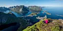 Hier schmiegen sich die rotgestrichenen, schneebedeckten Rorbuer unterhalb der schroffen, dunkelgrauen Granitgebirge malerisch an die Ufer kleiner Inseln. Der 450 Meter hohe Reinebringen ist einer der markantesten Gipfel – besonders beeindruckend ist er, wenn er mit Schnee bedeckt ist.