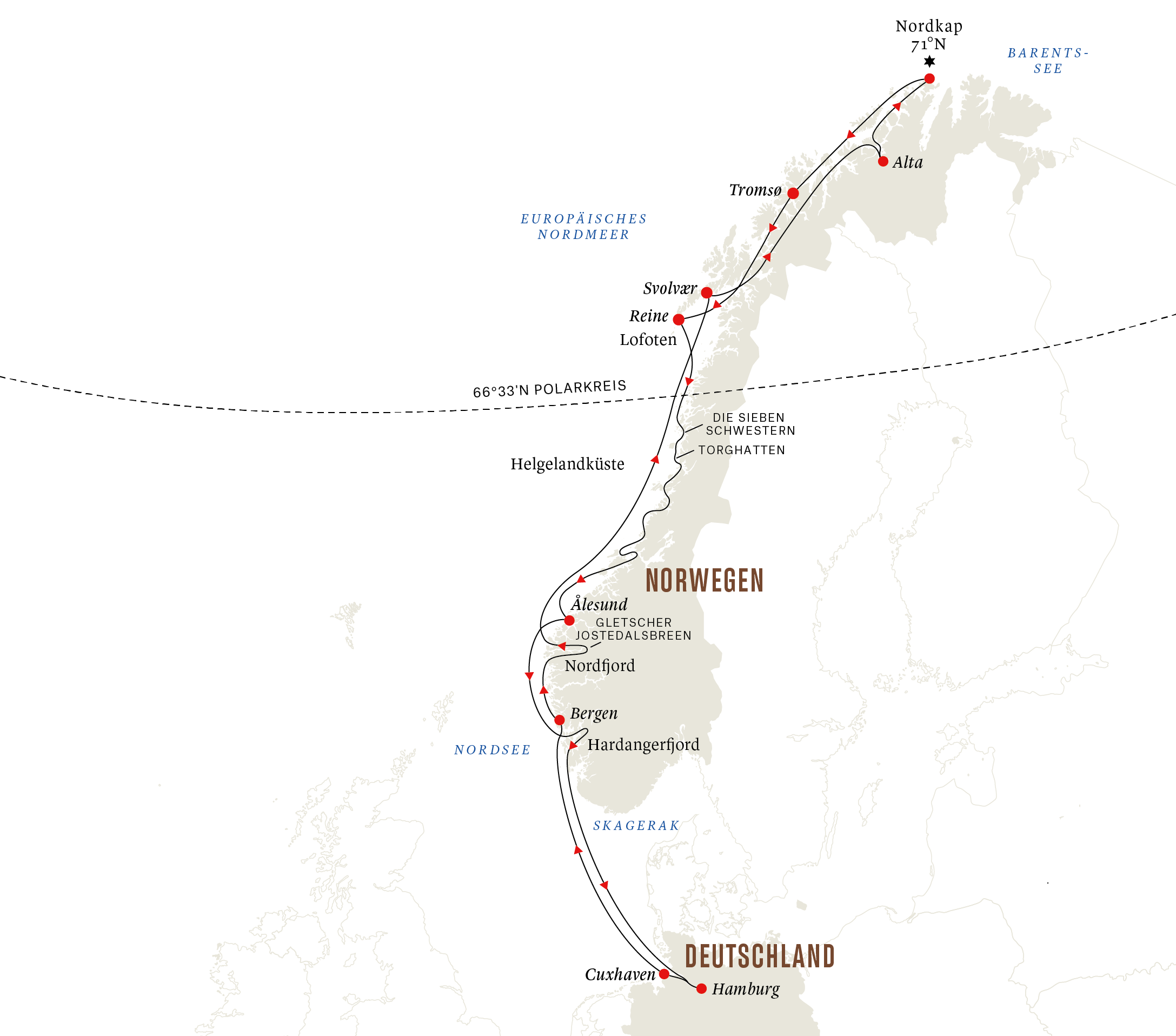 Wir lassen Hamburg hinter uns, durchfahren die Elbe und erreichen Cuxhaven, von wo aus wir unser nächstes Ziel, Norwegen, ansteuern. Schon seit Jahrhunderten ist der Hafen von Cuxhaven ein wichtiges Drehkreuz für deutsche Seefahrer und Auswanderer. Nehmen Sie an einer Veranstaltung teil, bei der Ihnen das Expeditionsteam alles über das bevorstehende Abenteuer im Land der Nordlichter erzählen wird. Ein heimischer Seemannschor wird einige Shantys zum Besten geben und im Museum der Hapag-Halle erfahren Sie im Rahmen einer Führung mehr über die geschichtlichen Aspekte unserer Reiseroute.