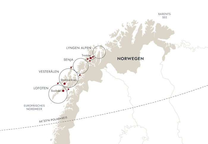 In den nächsten sieben Tagen werden wir vier verschiedene Regionen erkunden, jede mit ihren eigenen herausragenden Merkmalen und einzigartiger Schönheit. Die erste solche Region, die wir besuchen werden, ist Lyngen.