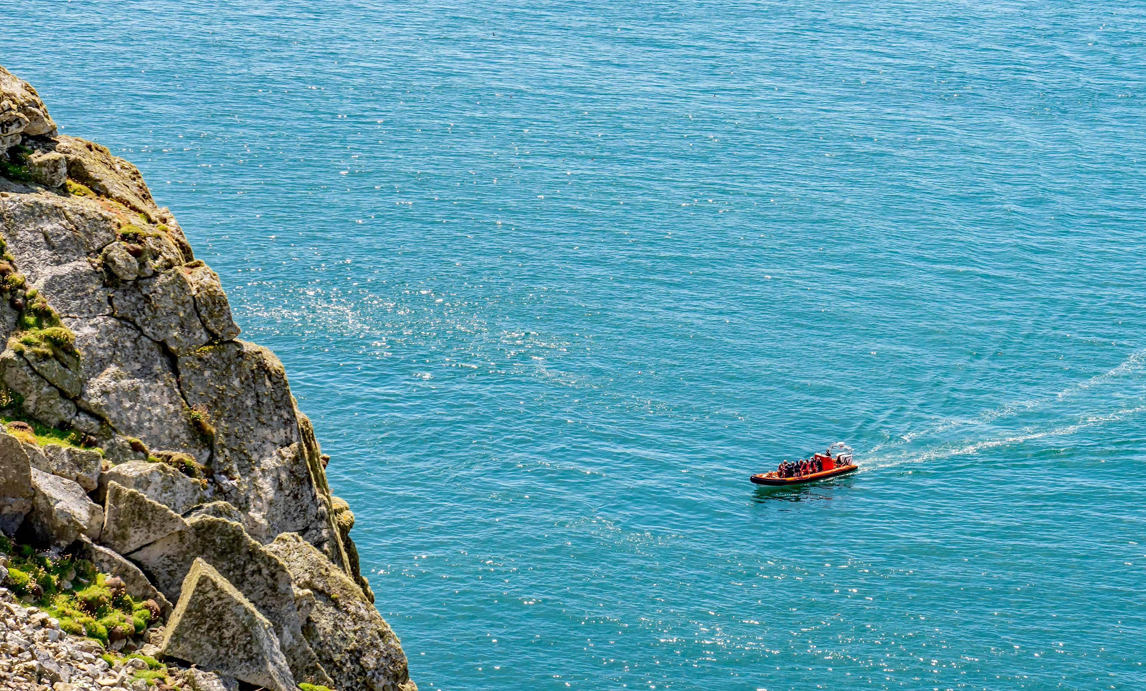 Vom Kai in Fishguard aus fahren wir durch den Pembrokeshire-Coast-Nationalpark bis zur nicht weit von St Davids gelegenen Bootsstation St Justinians. Hier gehen wir an Bord eines Ausflugsboots und machen uns zu einer spannenden Tour rund um Ramsey Island auf. Die Klippen der Insel wurden von der Königlichen Gesellschaft für Vogelschutz in Großbritannien zum Vogelschutzgebiet erklärt und sind im Frühling und Frühsommer der ideale Ort für brütende Seevögel.