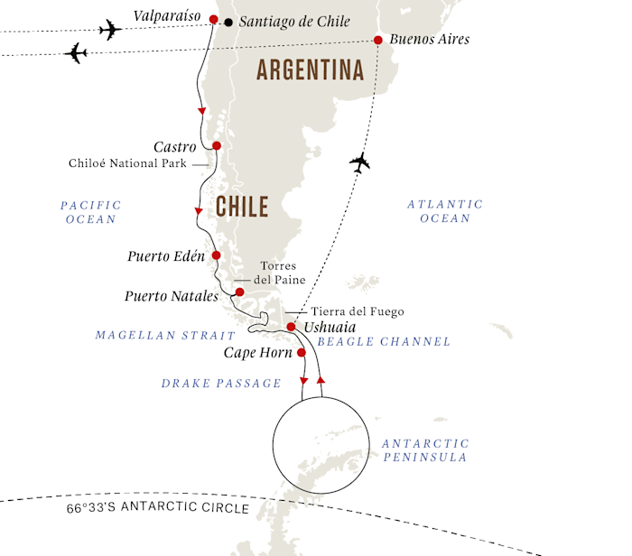 From Valparaíso, you’ll tour the Chilean fjords and waterways of Patagonia, stopping at rustic Castro, isolated Puerto Edén, and Puerto Natales, where you may get the chance to hike in Torres del Paine National Park. If weather allows, we’ll attempt to land the legendary Cape Horn before crossing the Drake Passage.