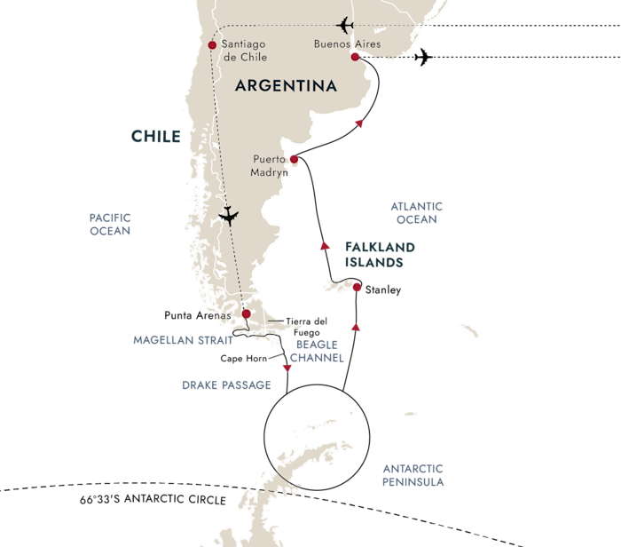 - Transfers between the airport and the hotel in Santiago de Chile before the expedition cruise
