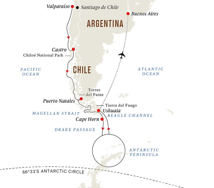 18-day expedition cruise from Valparaíso to Patagonia and Antarctica, ending in beautiful Buenos Aires