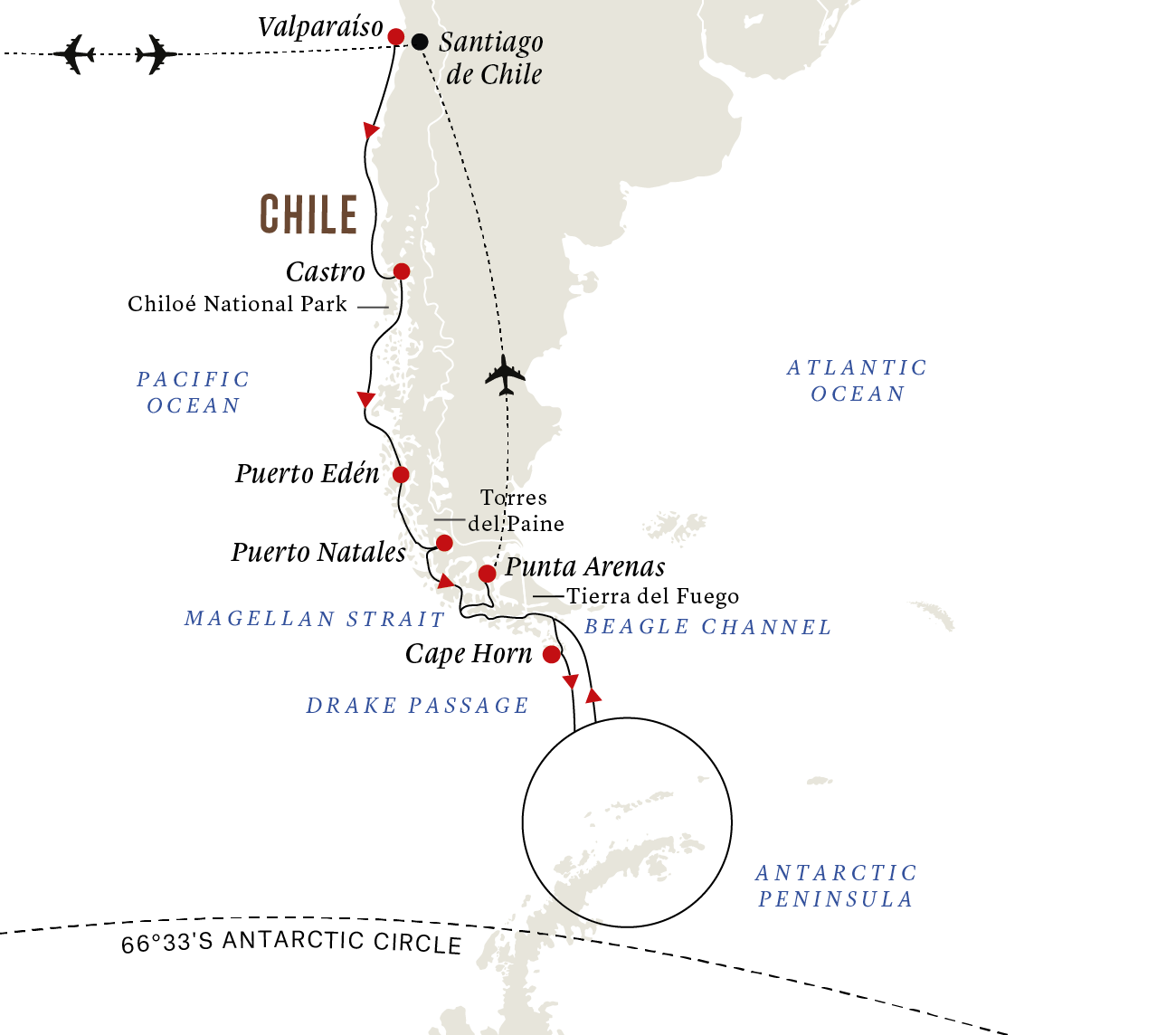 - Transfer from the hotel in Santiago de Chile to the ship in Valparaiso before the expedition cruise