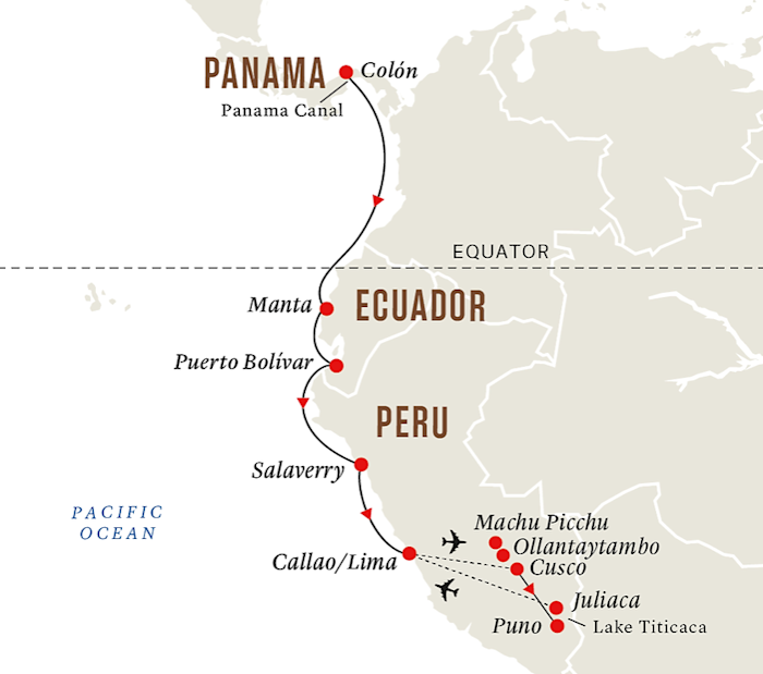 13-day expedition through the Panama Canal and down South America's Pacific coast, crossing the awe-inspiring Andean Plateau