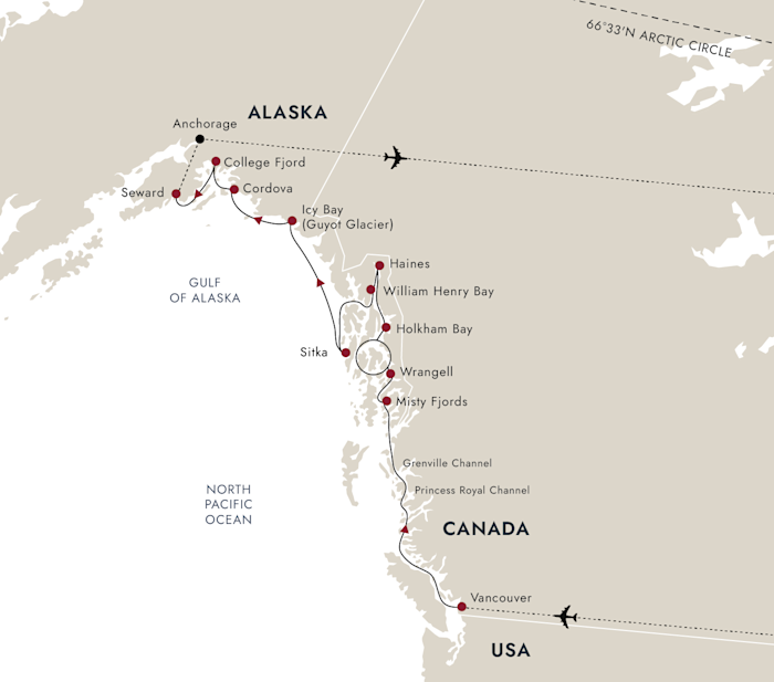 Journeying from Vancouver to Seward and on to Anchorage, discover Alaska’s captivating fjords, Gold Rush-era history, and rich culture.