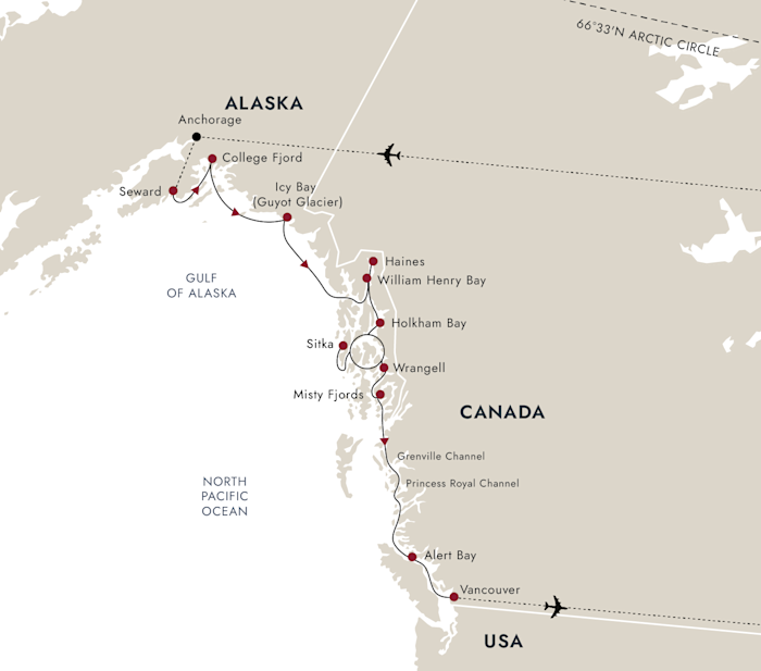 Explore the vast wilderness and historic towns of Alaska as you journey from Anchorage to Vancouver.