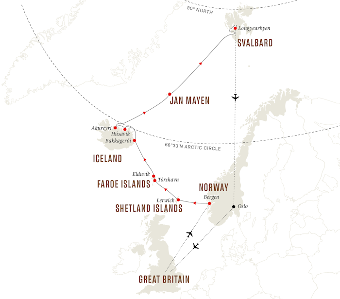 14-day expedition cruise from Bergen to the Shetland Islands, the Faroe Islands, Iceland and Svalbard before ending in Oslo