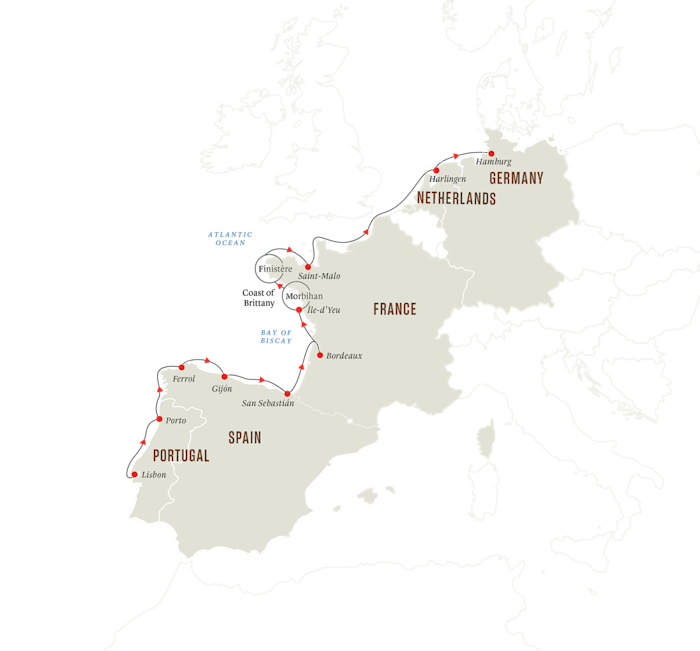 In France, you’ll enjoy fantastic experiences in Bordeaux, Île-d’Yeu and Brittany. Expect wild coastal landscapes, pretty fishing villages, medieval towns and rich maritime history. Discover the canal town of Harlingen before ending your adventure along Europe’s Atlantic coast in cosmopolitan Hamburg.