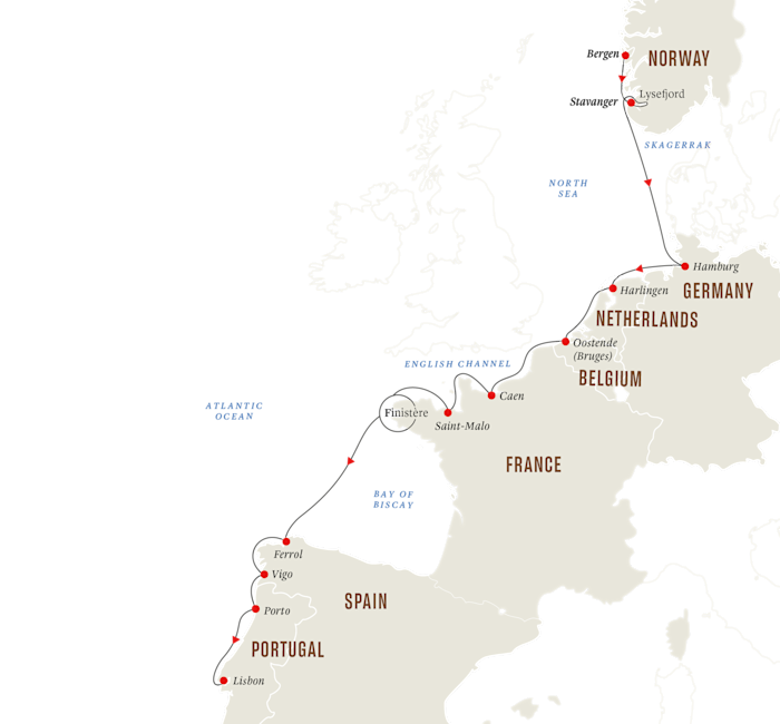 From beautiful Bergen, your European expedition cruise will sail to Stavanger and stunning Lysefjord. Across the North Sea, we'll explore historical coastal towns including Hamburg, Harlingen and Oostende. Enjoy rugged scenery and pretty towns along the western seaboard from Normandy to Ferrol.