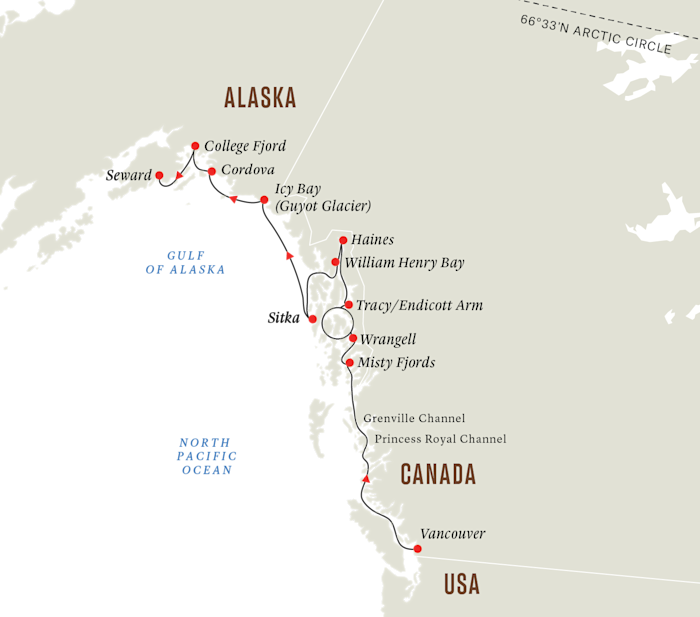 Journey from Vancouver to Seward to discover Alaska’s many fjords, Gold Rush-era history, glistening glaciers, rare wildlife, primeval rainforest, and rich Indigenous and Russian culture.