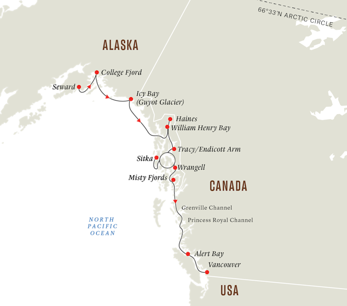 13-day expedition cruise from Seward to Vancouver, exploring the wilderness of Alaska and British Columbia
