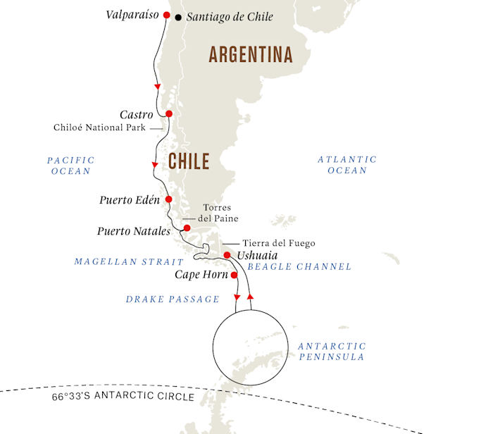 From Valparaíso, you’ll tour the Chilean fjords and waterways of Patagonia, stopping at rustic Castro and Puerto Natales, where you may get the chance to hike in Torres del Paine National Park. Weather permitting, we’ll attempt to land at legendary Cape Horn after crossing the Drake Passage on our way back from the White Continent.