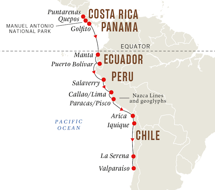 First call in Peru will be at Salaverry, where you can tour the ancient temple and city ruins around Trujillo. Then we head to colonial Lima, a UNESCO capital with a sumptuous cuisine offer. Next it’s Paracas, where you can visit bio-diverse Ballestas Islands, then the sun-soaked resort towns of Arica and Iquique, the old colonial town of La Serena, and eventually the UNESCO-listed Valparaíso, where your expedition will come to an end.