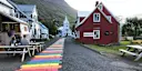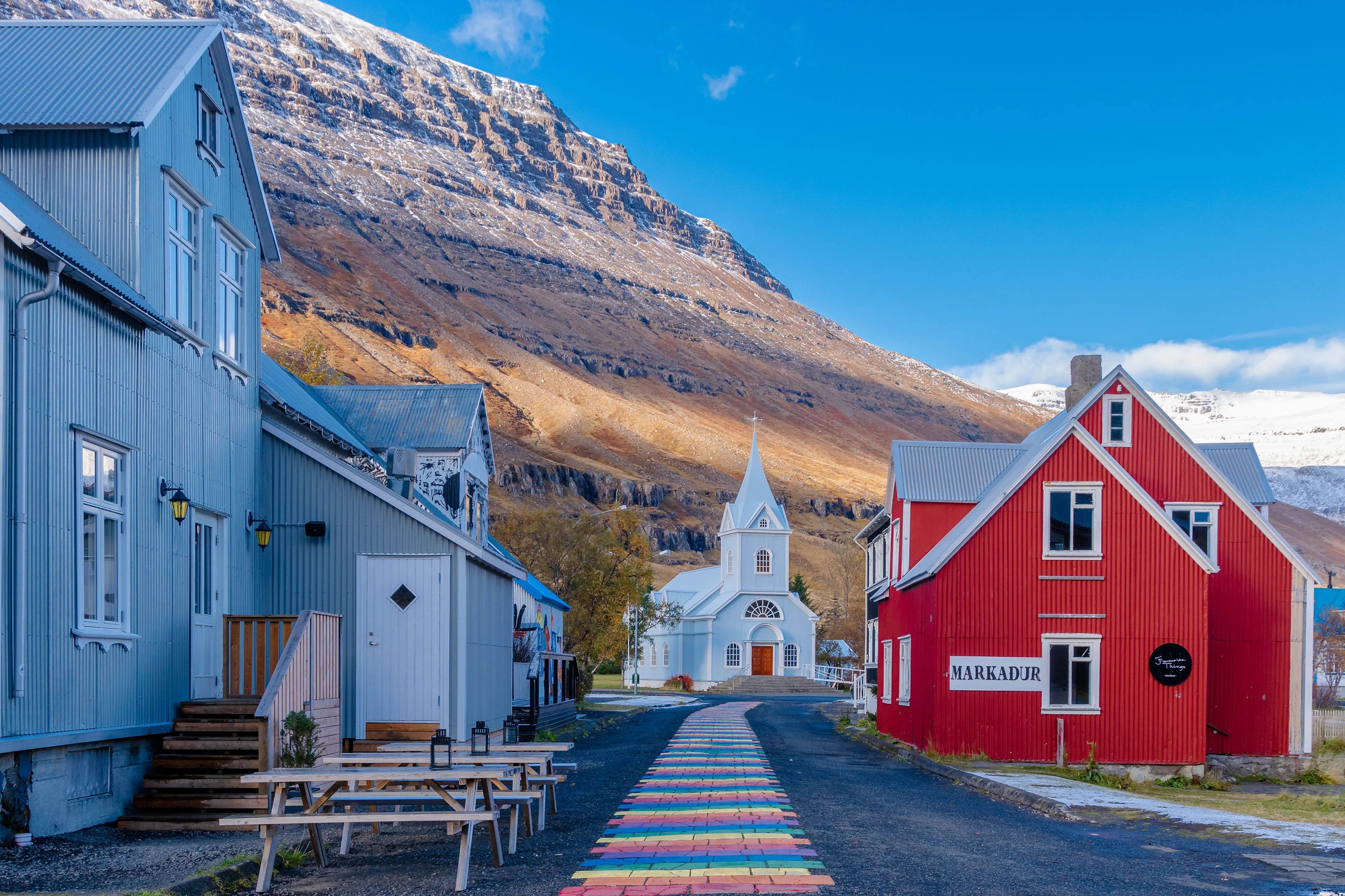At the end of a deep fjord with picturesque mountains and waterfalls lies the quirky village of Seyðisfjörður. Colorful wooden houses line the streets, while the aptly named Rainbow Road offers a vibrant photo opportunity.