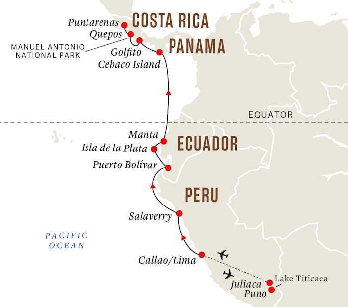 Your expedition cruise starts in Lima before taking you through coastal cities, islands, cultures and wildlife of Peru, Ecuador, Panama and Costa Rica. You’ll experience Incan and pre-Incan cultures through the marvels they left behind, and contemporary cultures in vibrant cities and ports, finishing your adventure in Puntarenas.