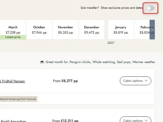 We’ve made it easy for solo travelers to find the best available rates. Scroll down to the departures section on any itinerary page and switch on the solo traveler toggle. This will automatically display available savings for solo travelers.
