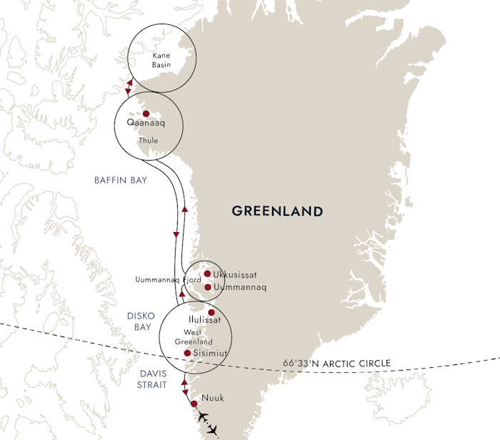 This voyage begins and ends in Nuuk with flights from/to Copenhagen. An option to fly from/to Reykjavík instead can be seen here.