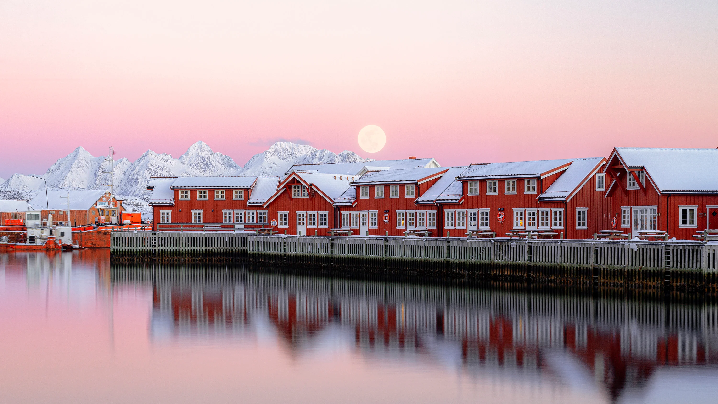 Cosy-looking houses cluster together around the bay, the reflections of their lights shimmering like candles in the waters below. The wonderful wintery atmosphere is even more captivating when the village is coated with a snug blanket of snow.