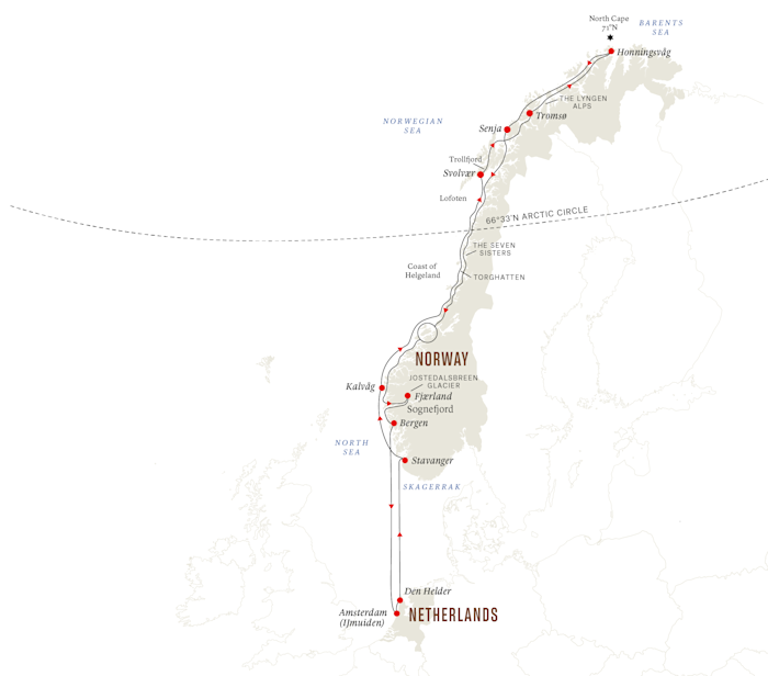 14-day expedition cruise from Amsterdam to the North Cape, exploring Norway’s coastal communities and majestic fjords