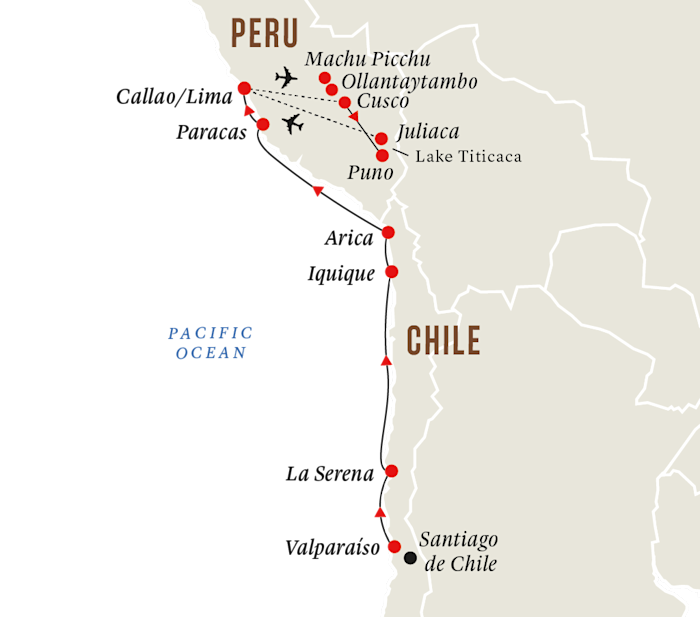 Explore vibrant coastal gems in Chile and Peru, before heading to mystical Machu Picchu and crossing the Altiplano to Lake Titicaca on this cruise and land adventure.