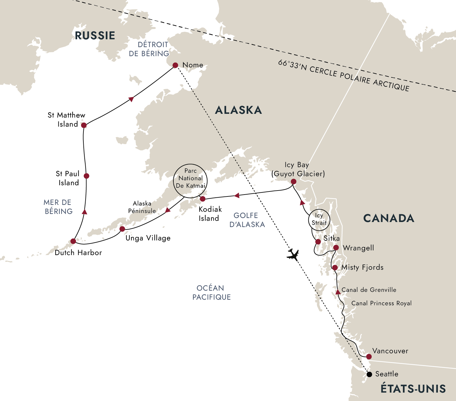 - Transfert du navire à l’aéroport à Nome après la croisière d’expédition