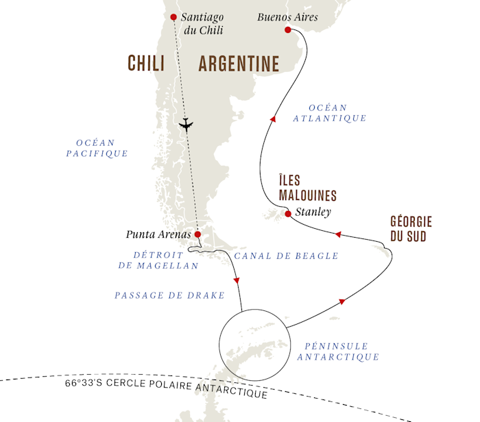 Aventure de 24 jours en Antarctique, Géorgie du Sud, aux îles Malouines et à Buenos Aires, au départ de Punta Arenas en Patagonie.