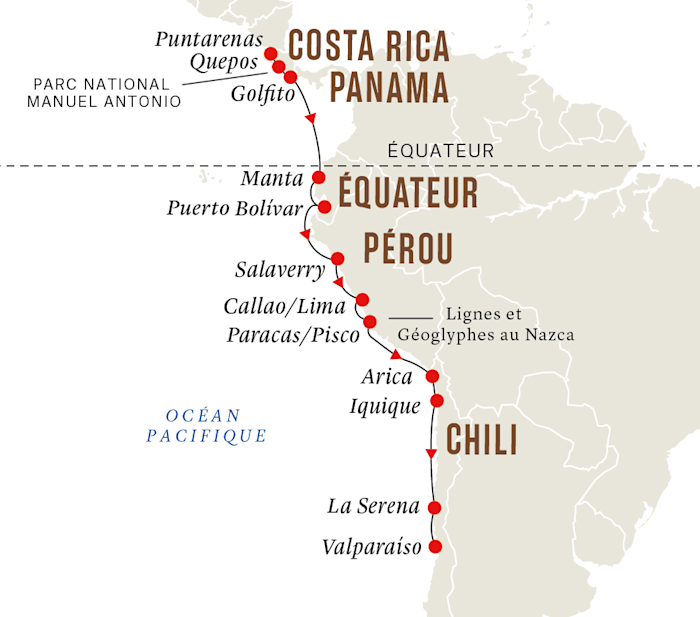 Depuis Puntarenas, nous naviguerons jusqu’aux ports de Quepos et Golfito, voies d’accès aux parcs nationaux costaricains environnants qui regorgent d’habitats pittoresques et d’une faune abondante, entre toucans, iguanes, paresseux, singes et une grande variété d’oiseaux marins. Nous ferons escale à Manta pour visiter Montecristi où furent inventés les chapeaux Panama, toujours fabriqués à la main ainsi qu’à Puerto Bolívar, l’occasion de comprendre l’importance historique de l’« oro verde » pour l’économie locale.
