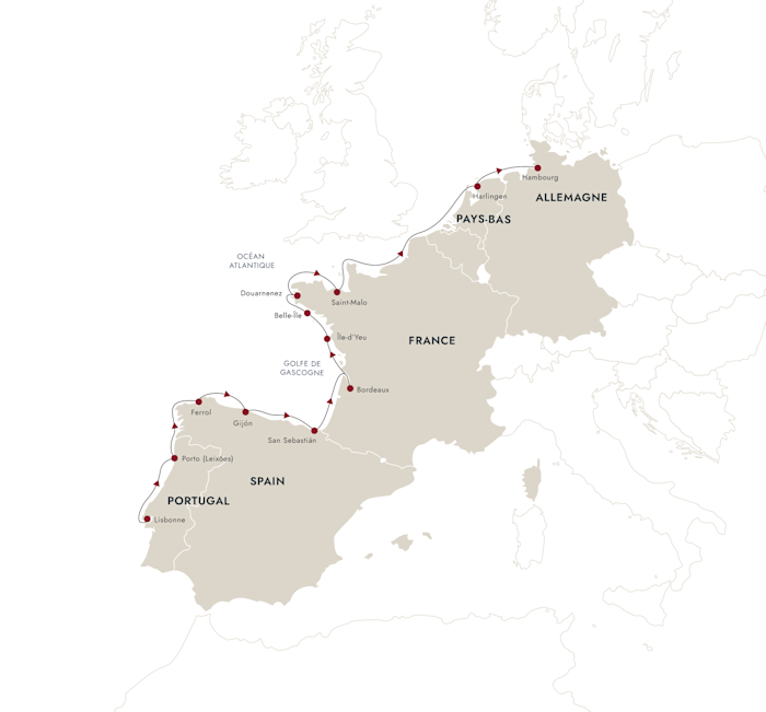Naviguez du Portugal jusqu’à l’Allemagne, en passant par l’Espagne, la France et les Pays-Bas, tout en explorant les trésors historiques et culturels de leurs célèbres villes portuaires.