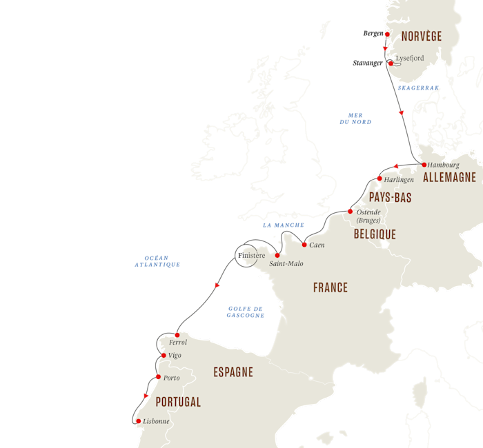 Au départ de la magnifique ville de Bergen, votre croisière d’expédition européenne vous mènera à Stavanger et au magnifique Lysefjord. De l’autre côté de la mer du Nord, nous explorerons des villes côtières telles que Hambourg, Harlingen et Ostende. Profitez des paysages accidentés et des jolies villes le long du littoral occidental de l’Europe, de la Normandie à La Ferrol.