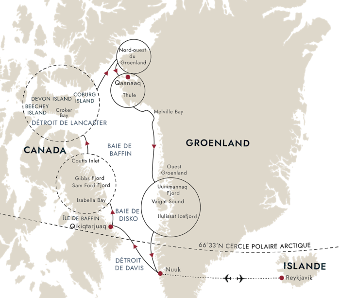 Après un vol au départ de Reykjavik, votre voyage de découverte commence à Nuuk. Au fil de cette croisière d’expédition, vous découvrirez les merveilles de quatre régions arctiques : la côte est escarpée de l’île de Baffin, les rivages azurés de l’île de Devon, les fjords vertigineux du nord-ouest du Groenland et l’impressionnante baie de Disko, à l’ouest du Groenland.