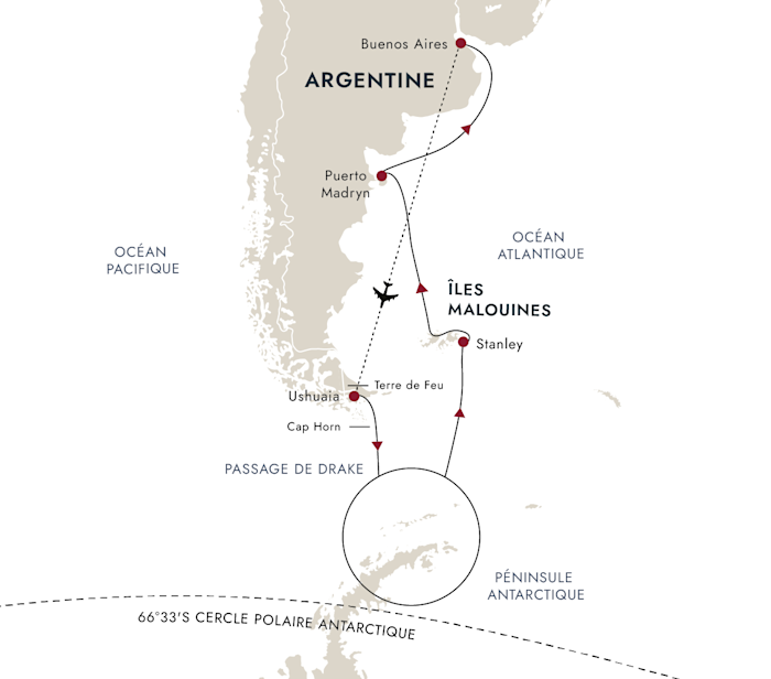 Votre aventure commence par un vol matinal à destination d’Ushuaïa. C’est là que vous attend votre navire d’expédition à propulsion hybride, spécialement conçu pour naviguer dans les eaux polaires.
